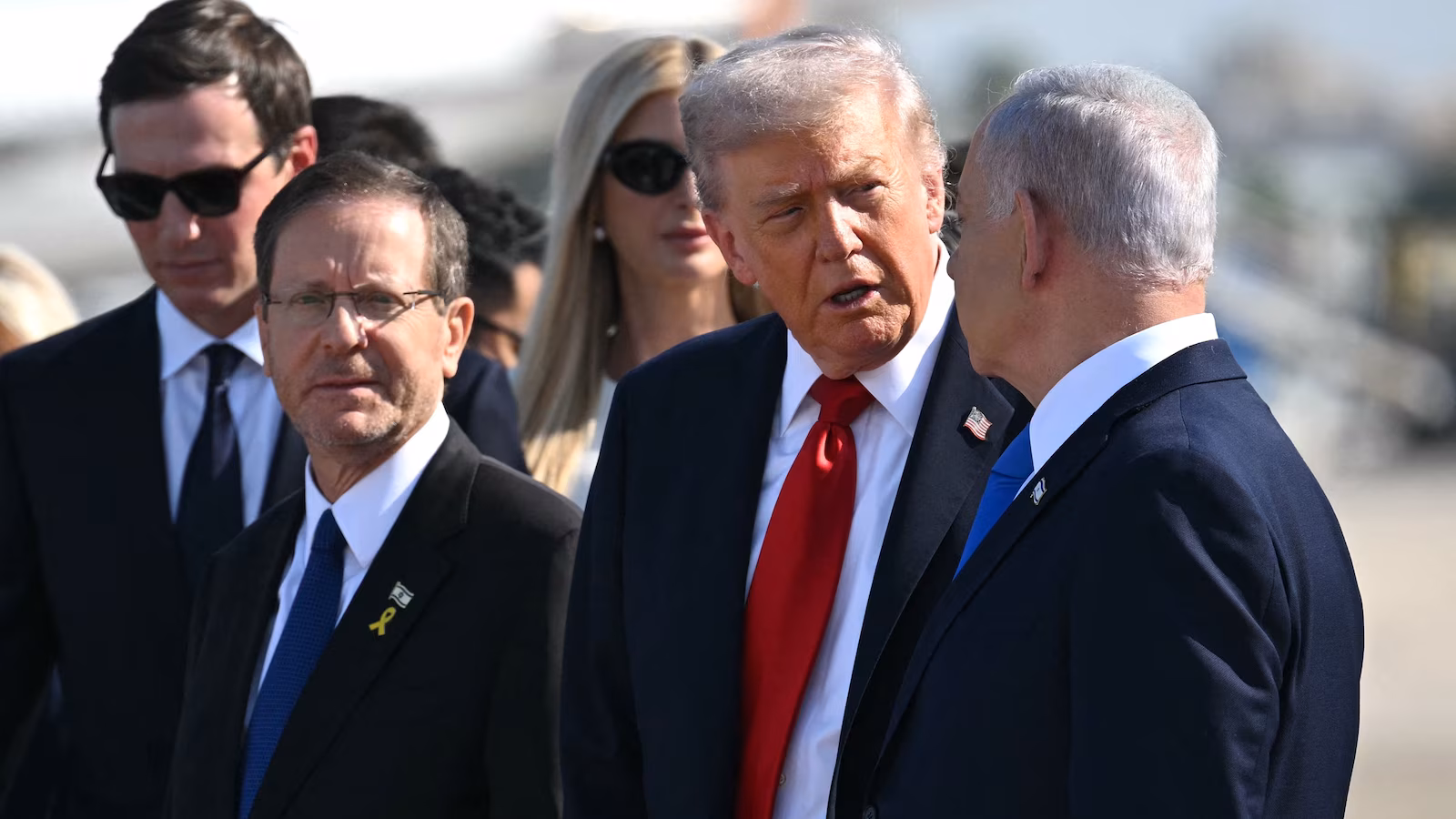 Israel’s Prime Minister Benjamin Netanyahu and President Isaac Herzog greet U.S. President Donald Trump upon his arrival at Ben Gurion Airport on the outskirts of Lod near Tel Aviv on Oct. 13, 2025.