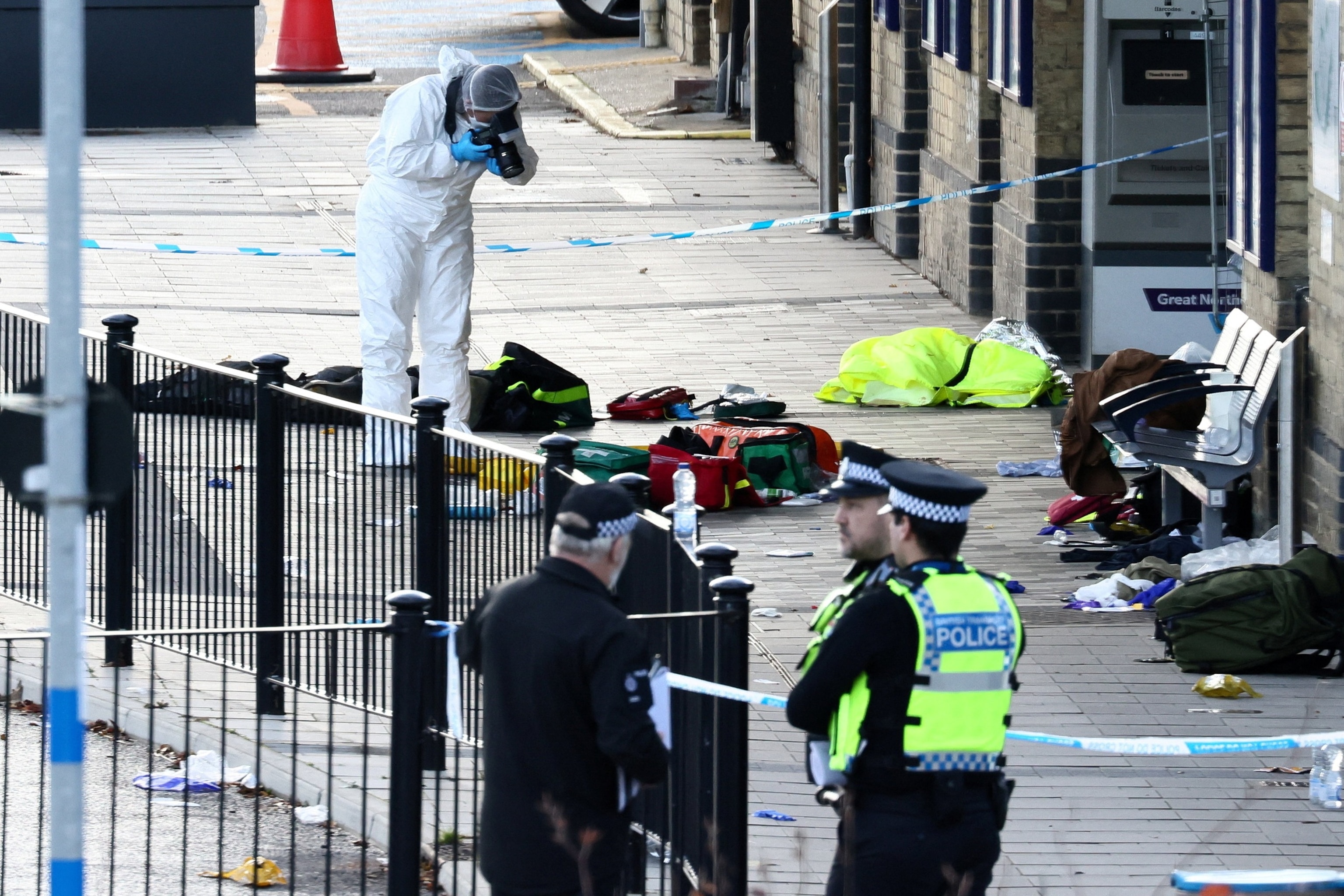 A forensic officer takes pictures at the cordoned-off area at Huntingdon train station, following a series of stabbings on a London North Eastern Railway (LNER) train, near Cambridge, U.K., on Nov. 2, 2025.