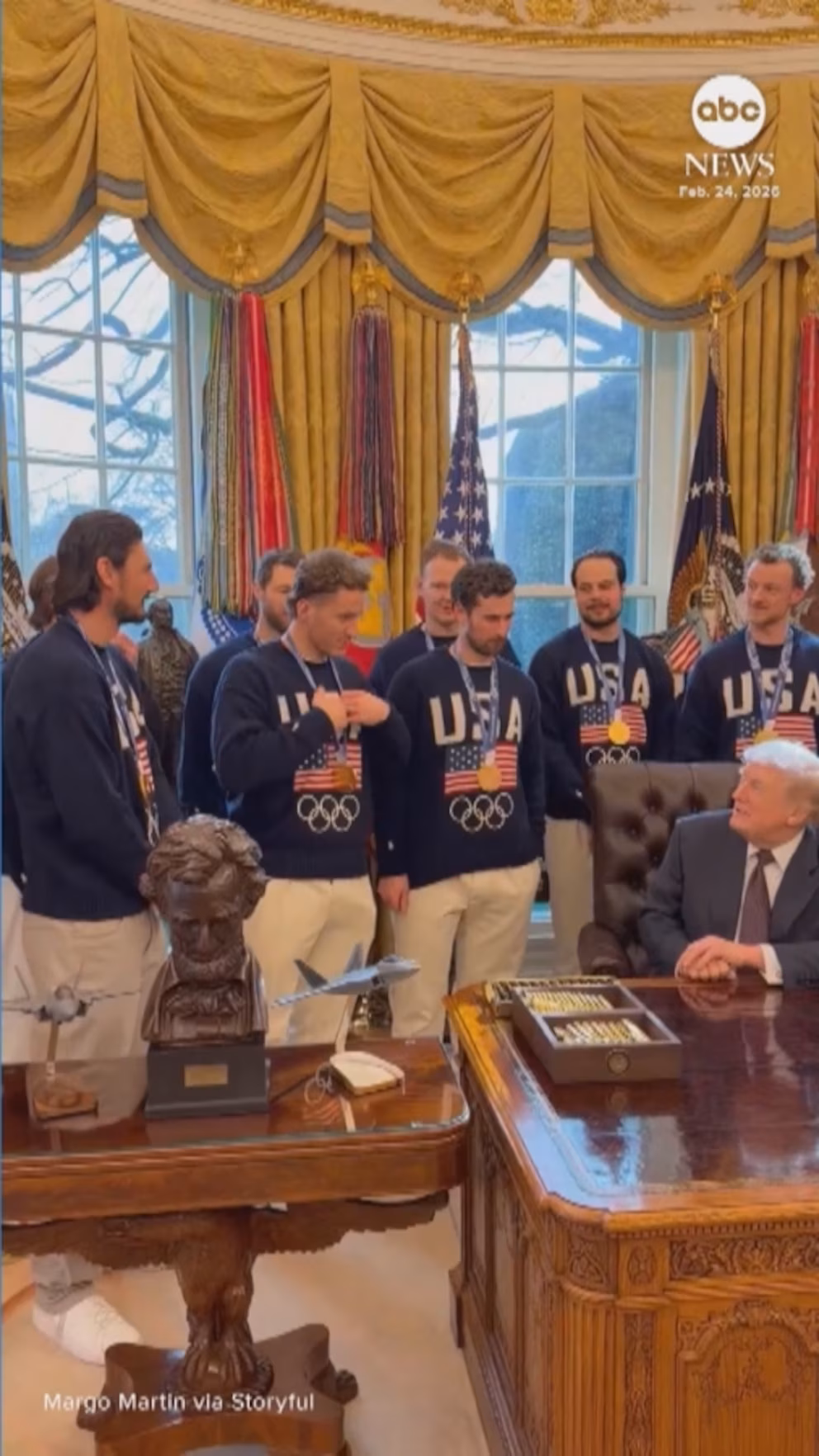 Members of the men’s U.S. Olympic hockey team met with President Trump in the Oval Office and showed off their gold medals, in video shared by the White House on social media.