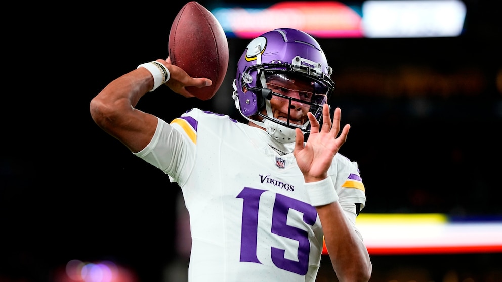 Minnesota Vikings quarterback Joshua Dobbs warms up prior to an NFL football game against the Denver Broncos, Nov. 19, 2023, in Denver.