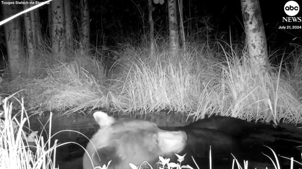 A bear was spotted taking a relaxing dip in a pond next to some mint leaves in South Lake Tahoe, California.