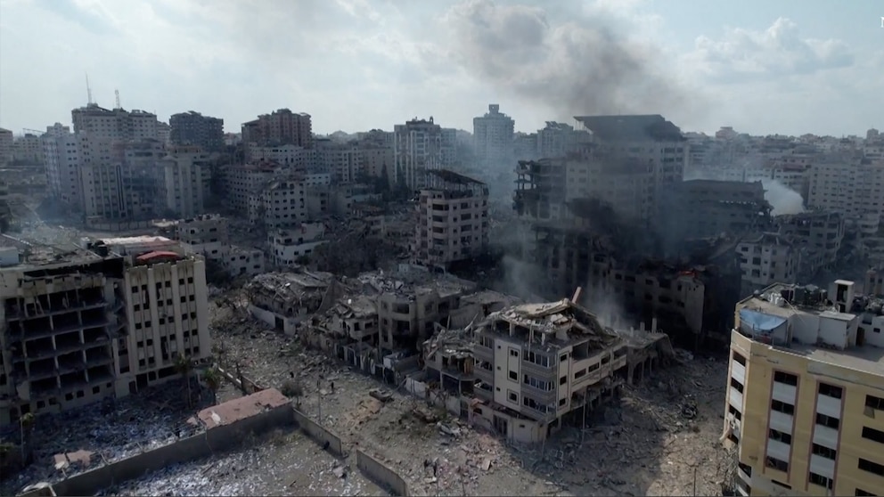 Drone footage shot on Oct. 10 shows wide-scale damage in Gaza, after days of Israeli airstrikes carried out after Hamas launched an unprecedented attack inside Israel.
