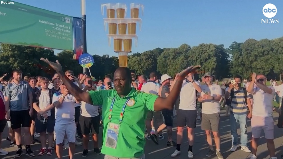 A volunteer at Euro 2024 demonstrated incredible skill, but not of the sporting variety, successfully stacking nine pints of beer on his head and walking around with them.