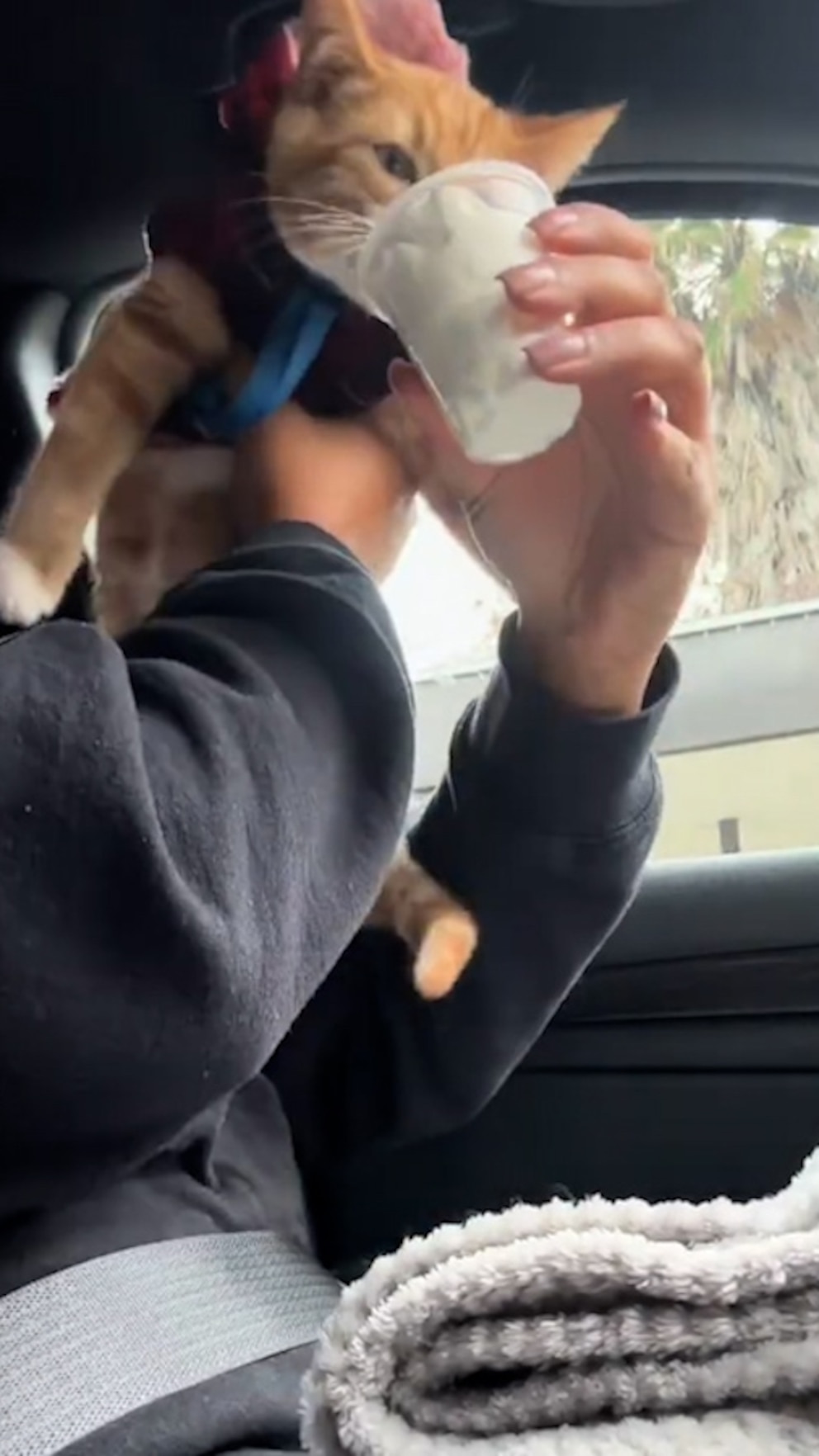 Footage shows the feline meowing in excitement at a Starbucks drive-thru.