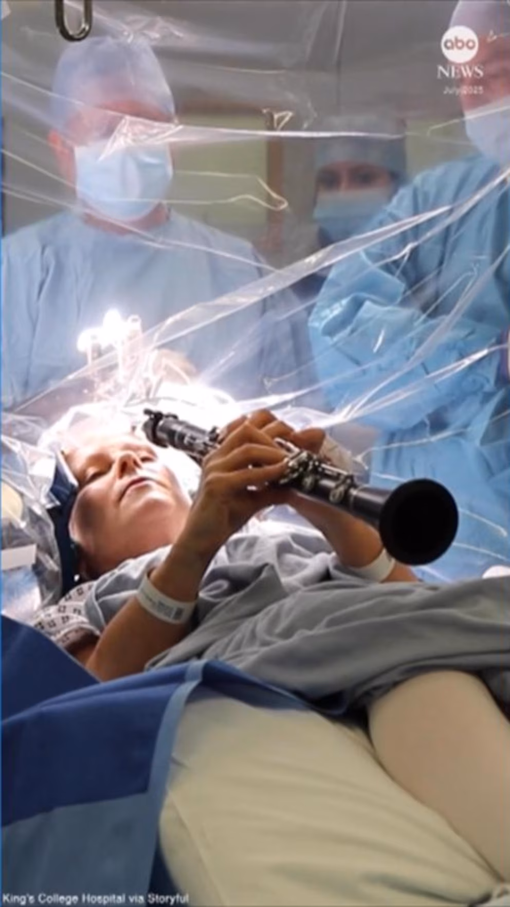A patient undergoing brain surgery plays the clarinet, allowing surgeons to instantly hear the impacts of the treatment.