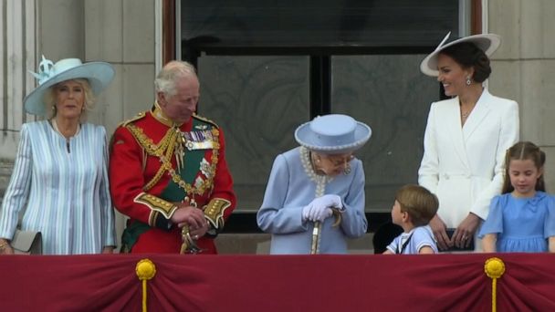 Queen Elizabeth II held court on the balcony of Buckingham Palace on Thursday, where the royal family gathered to watch the military flypast at the end of Trooping the Color.