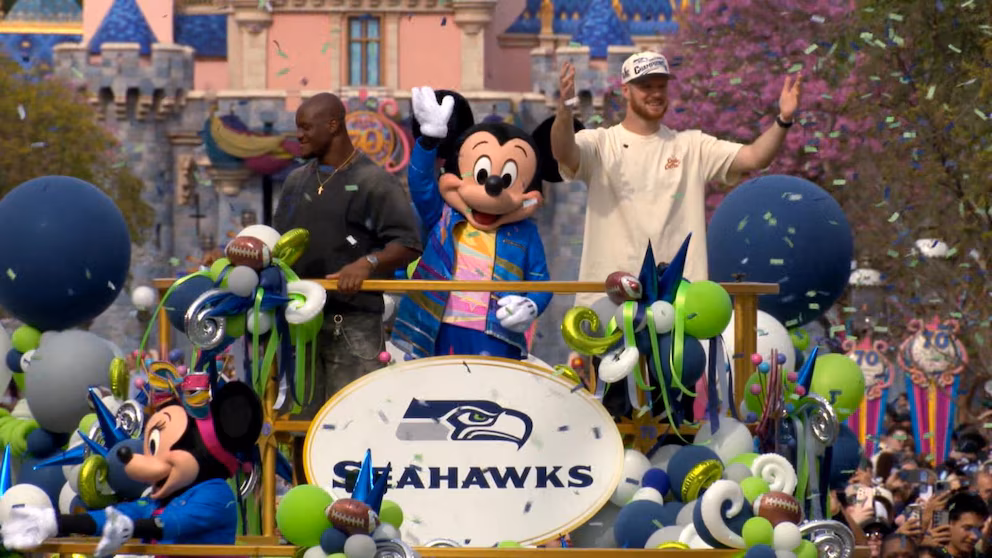 Fresh off their Super Bowl win, a couple of players from the Seahawks take part in a 40-year-old tradition at Disneyland.