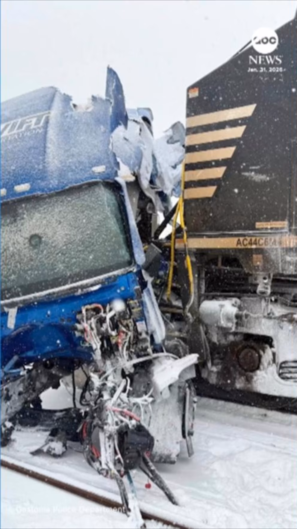 A train hit a semi-truck that was stuck in the snow on railroad tracks Saturday in Gastonia, North Carolina. Officials said the driver was able to escape uninjured.