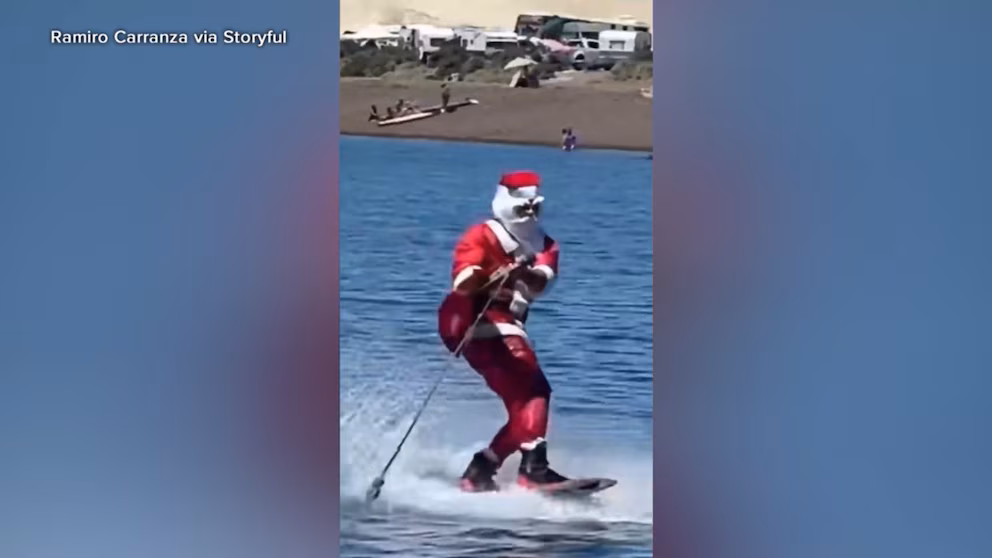 A man dressed like Santa on a wakeboard entertains beachgoers in Argentina.