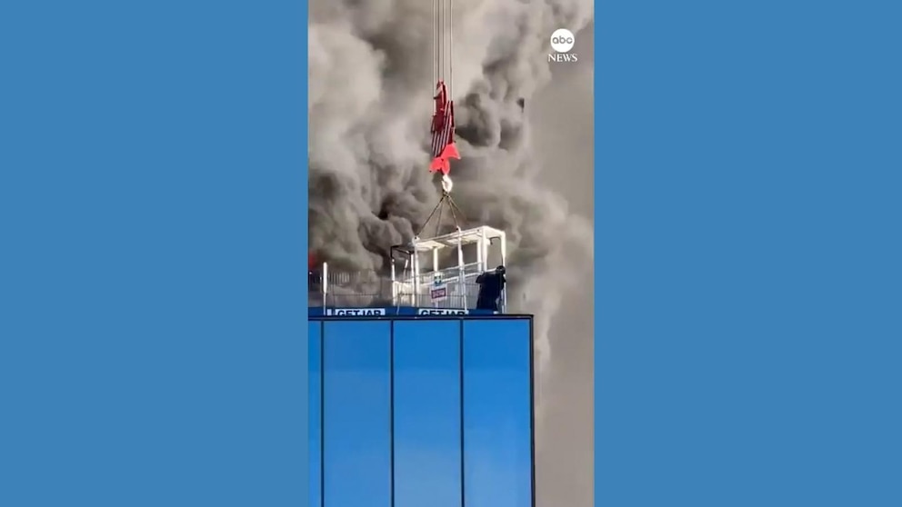 Dramatic eyewitness video shows a worker being lifted to safety by a crane after being trapped on the roof of a burning high-rise.